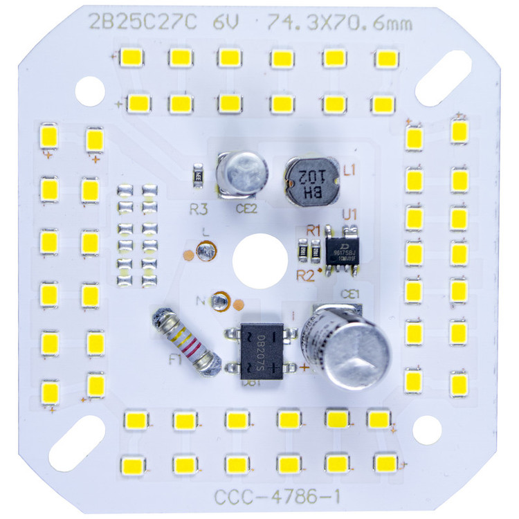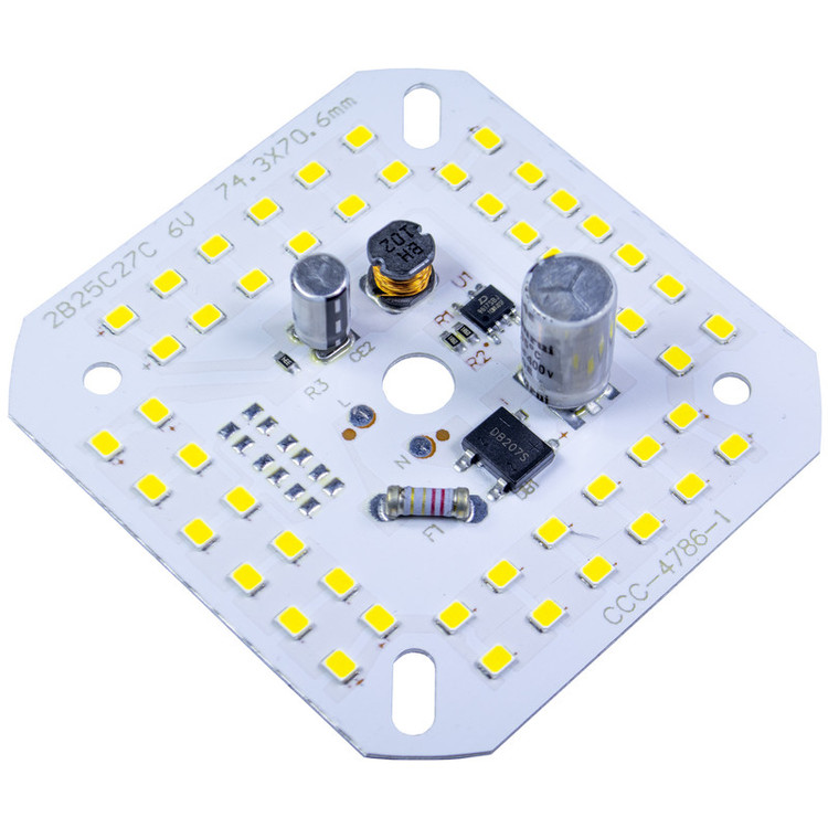این چیپ مجهز به خازن آنتی شوک میباشد که هم از لرزش و چشمک زدن نور جلوگیری میکند و هم باعث افزایش نور چیپ میشود . این چیپ با برق مستقیم شهری (220 ولت) روشن میشود و در تعمیر یا ساخت لامپ ها و پرژکتور ها و پنل های ال ای دی استفاده میشود . جهت استفاده از این چیپها پیشنهاد میشود با استفاده از خمیر سیلیکون به خنک کننده آلومینیومی (heat sink) مناسب به منظور جلوگیری از افزایش دمای چیپ و کاهش عمر محصول چسبانیده شود . این محصول دارای 50 عدد ال ای دی , شار نوری 5250 لومن و طول عمر 40000 ساعت میباشد . روی چیپ دو حرف L و N وجود دارد که فاز و نول به آنها متصل میشود .